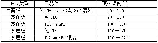 印制板預(yù)熱溫度和時間要根據(jù)印制板的大小、厚度、元器件的大小和多少,以及貼裝元器件的多少來確定。預(yù)熱溫度在90—130℃(PCB表面溫度),多層板及有較多貼裝元器件時預(yù)熱溫度取上限。預(yù)熱時間由傳送帶速度來控制。如預(yù)熱溫度偏低或和預(yù)熱時間過短,焊劑中的溶劑揮發(fā)不充分,焊接時產(chǎn)生氣體引 起氣孔、錫珠等焊接缺陷;如預(yù)熱溫度偏高或預(yù)熱時 間過長,焊劑被提前分解,使焊劑失去活性,同樣會引起毛刺、橋接等焊接缺陷。因此,要恰當控制頂熱溫度和時間,最佳的預(yù)熱溫度是在波峰焊前涂覆在PCB底面的焊劑帶有粘性(見表3-1)。